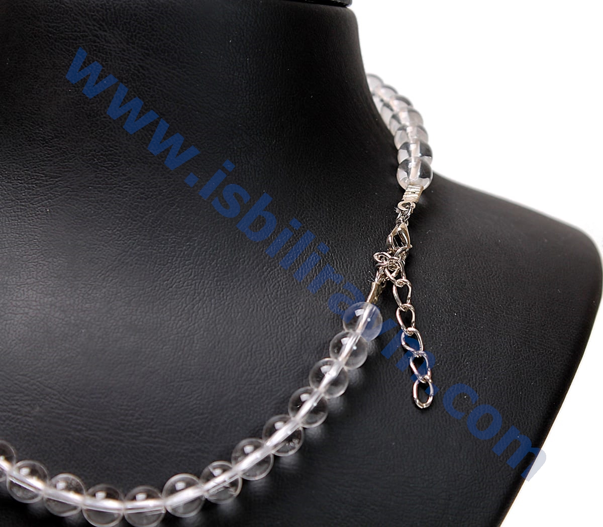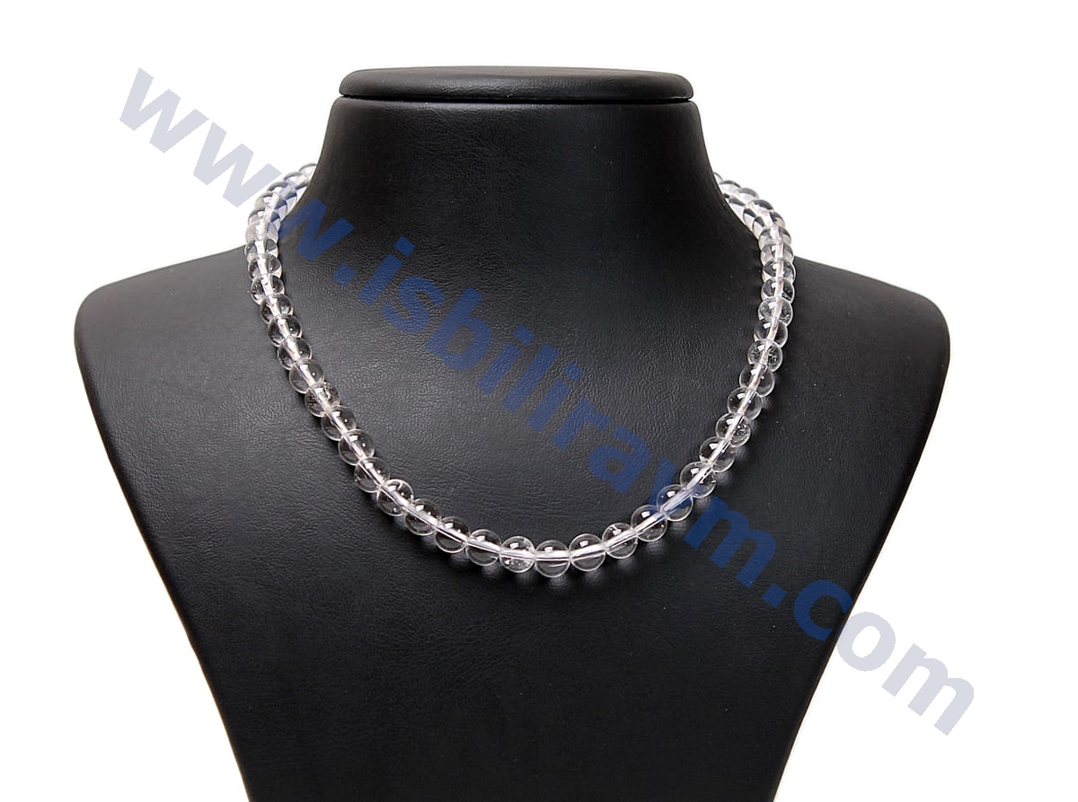Bu kristal kuvars kolye kristal kuvars taşının en güzel tonlarından özel olarak şeçilerek üretilmiştir. Orijinal taşlardan üretilen bu kolyeleri sizler için ürettik. Ürünlerimizde orjinal doğal taşların yanı sıra estetikliğini arttırmak amacıyla bazı süsleme aparatları kullanılmış ve ürünlerin estetik görünümleri arttırılmıştır. Kullanılan bu aparatlar oksitli metal ve  dökümden üretilmiştir, kimyasal bir elementle temasta bulunmadığı taktirde kararmalara karşı uzun süreli dayanıklı, sağlamdır. Ayrıca orijinal kristal kuvars kolyelerimiz firmamızın özel olarak üretmiş olduğu daha önce doğal taşlarda ip kesme problemini ortadan kaldırmak için kullanılan kopma ve dağılmalara karşı dayanıklı, kopmayan taş ipi olan misina lastiğine dizilmiştir. Normal kullanımda bu ip oldukça dayanıklı, esnek ve uzun ömürlüdür. Bu özellikleriyle doğal taşlı kolyeleri uzun süreler rahatlıkla kullanabilirsiniz. Bu doğal taş kolyeleri hem estetik görünmek için takı olarak hemde doğal taşların muhteşem enerji ve faydalarından yararlanabilmek için kullanabilirsiniz. Bu ürün orjinal kristal kuvars taşından üretildiği için kristal kuvars taşının şu psikolojik ve fiziksel faydalara sahiptir ; Kristal kuvars taşı çevredeki vücudumuzdaki radyasyonu toplar. Bilgisayar, televizyon vb. radyasyon yayan ürünlerin yanına bu taş koyulduğunda radyasyonu çekerek bizi radyasyonun zararlarından kurtarır. Kristal kuvars taşı çevremizde oluşan negatif enerjiyi yok eder. Negatif enerjiyi pozitif enerjiye çevirir. 6. hissi sevgi ve şevkat duygularını güçlendirir. Gözler ve göz hastlıkları için faydalıdır. Duygusal dengeleyicidir. Beyin fonksiyonlarını uyararak daha sağlıklı çalışmasını sağlar. Konsantrasyonu arttırır. Baş ağrılarını hafifletir. Kristal kuvars taşı üzerinizde kullanıldığında  çevrenizdeki  negatif enerji kişilerden sizi korur.sindirim sistemini düzenler. Kandolaşımını düzenler. Gözler için faydalıdır. Görme gücünü arttırıcı etkileri vardır. Kristal kuvars taşını bir müddet kullandıktan sonra toprağa bir süre gömülmelidir çünkü topladığı zararlı enerjileri boşaltması gerekir.