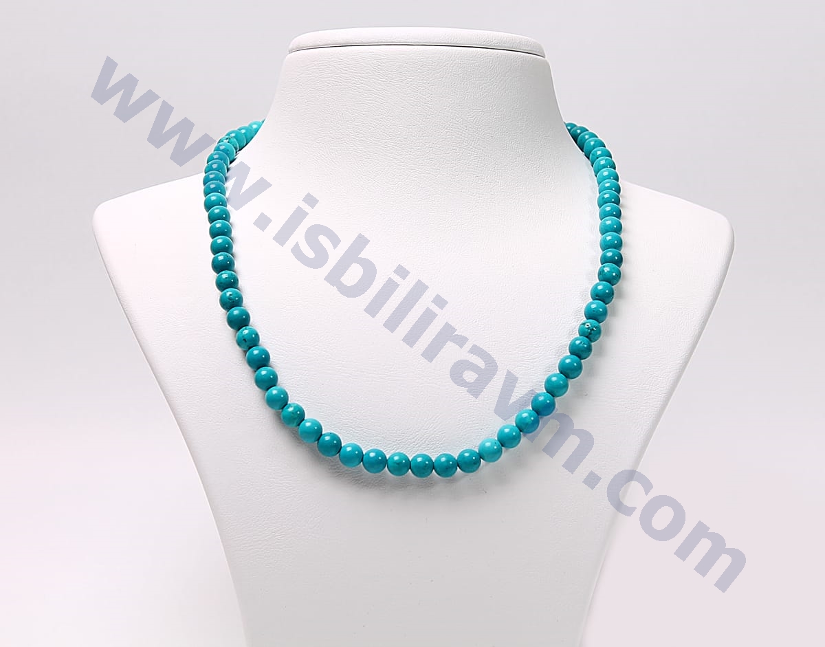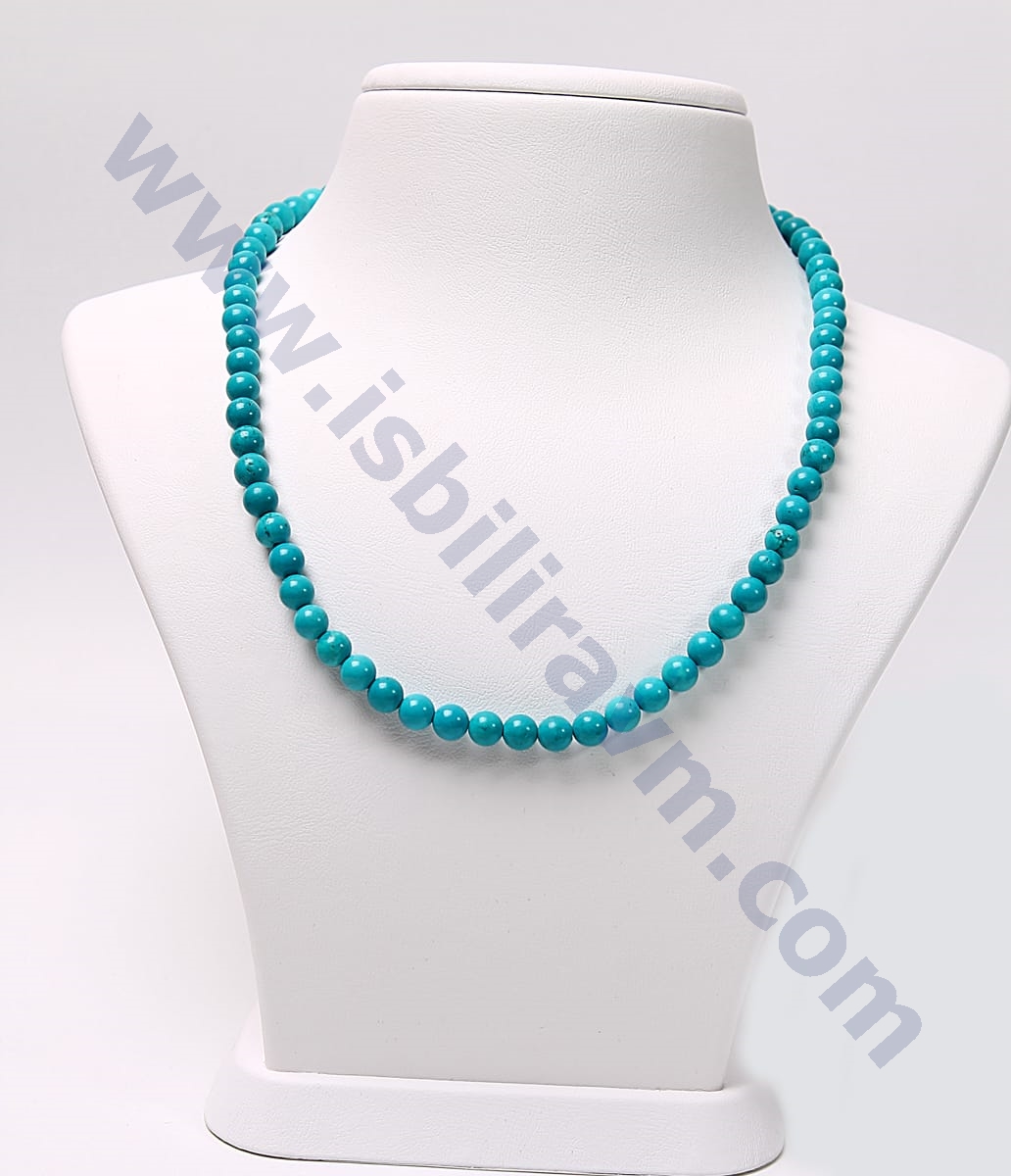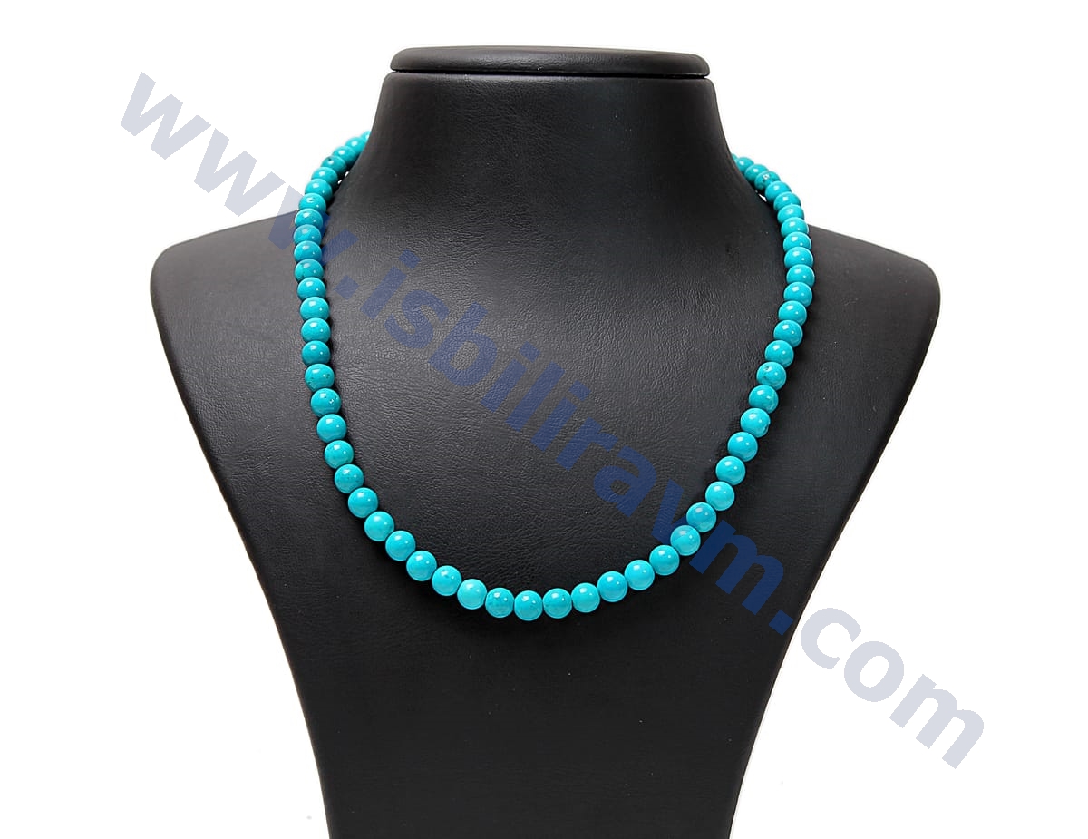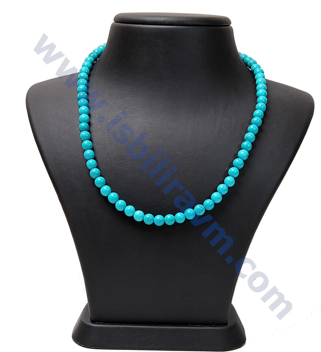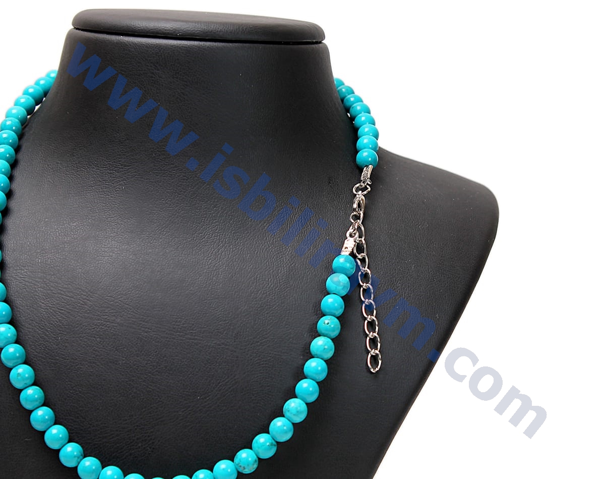 NOT: Turkuaz (firuze) taşlarını renklendirilmiş sıkma ve orijinal olmak üzere iki farklı alternatif şeklinde sizlere sunulmaktadır. Sıkma turkuaz ürünler; orijinal turkuaz (firuze) taşlarının tozları ile deniz kumlarının karıştırıldıktan sonra yüksek ısılı fırınlarda boyanarak presslenmesi sonucu oluşmaktadır. Sıkma ürünlerdeki orijinal turkuaz taşı tozu oranı %5-10 civarındadır. Geri kalan oran ise deniz kumudur. Orijinal ürünler ise direk taşın ham halinden hiçbir katkı maddesi olmaksızın üretilmiş olanlarıdır. Bu kolye renklendirilmiş sıkma turkuaz taşından imal edilmiştir.