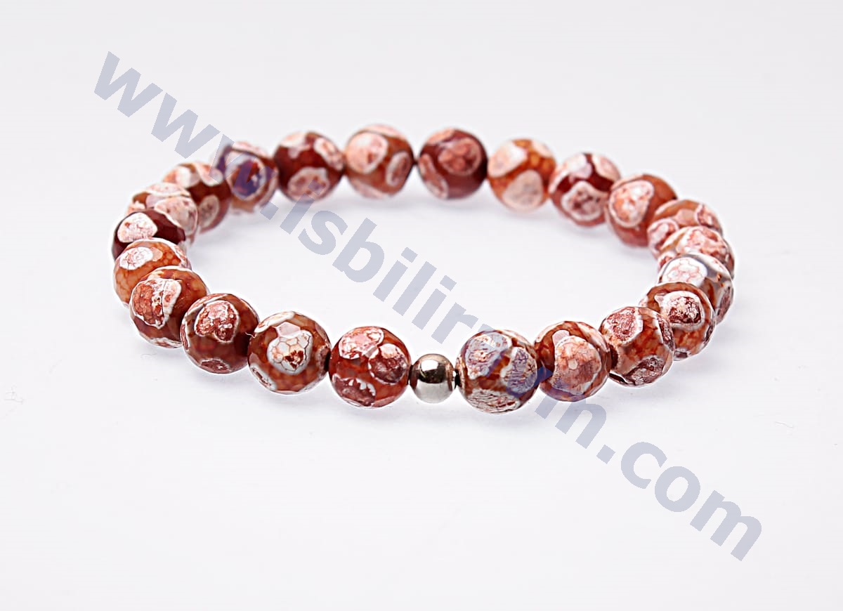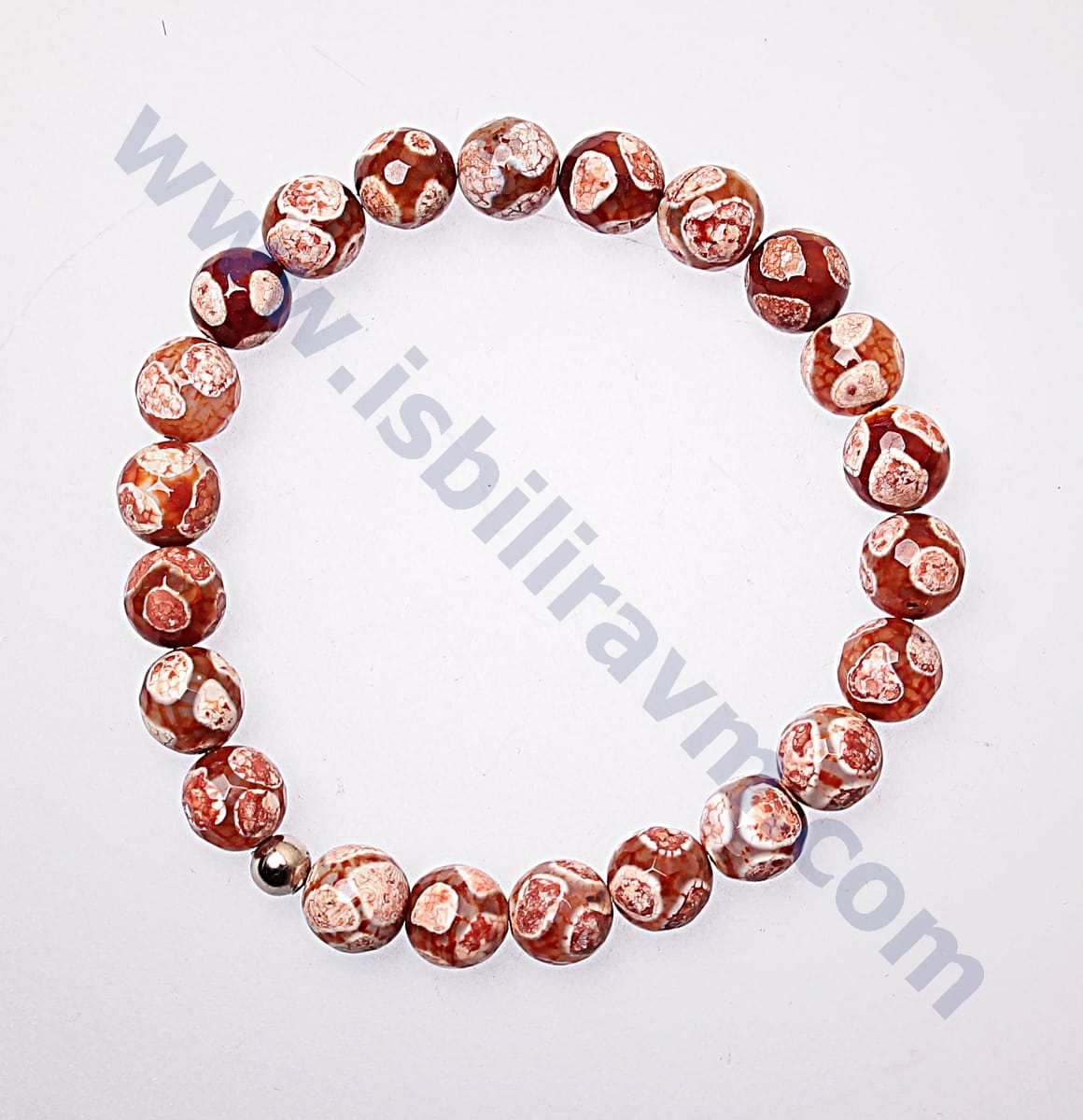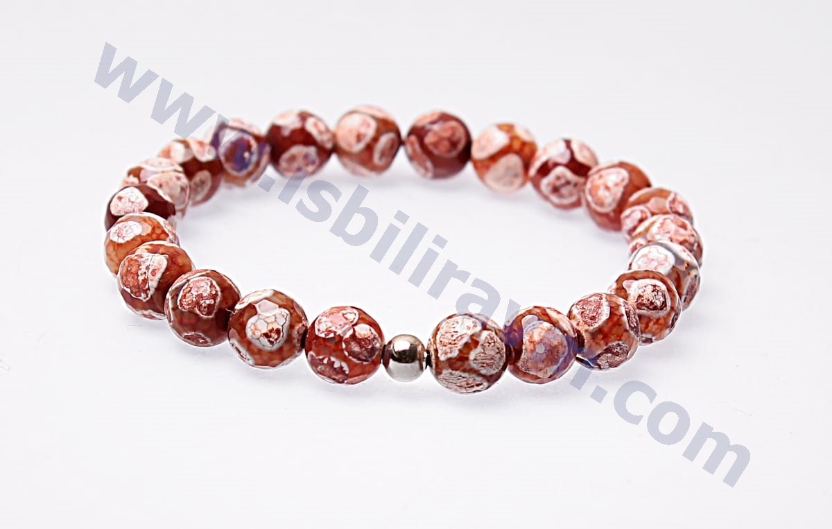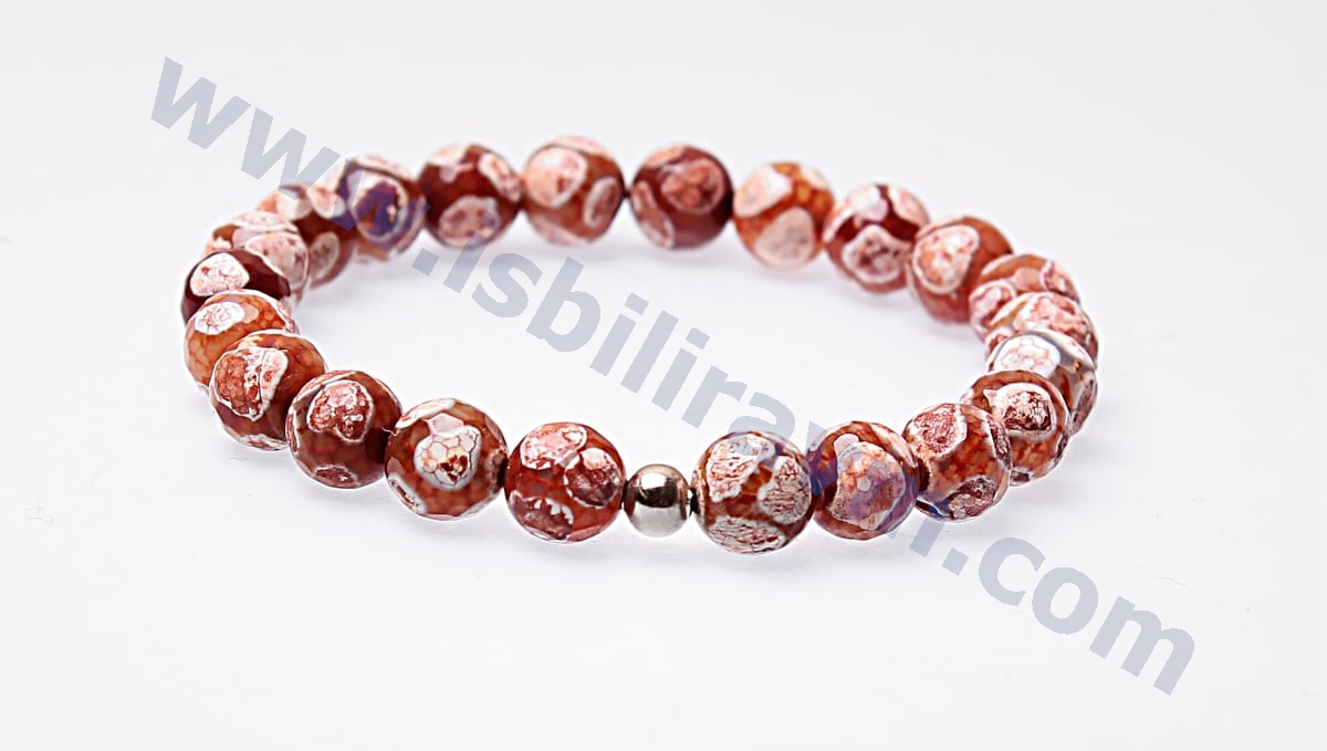 Bu akik taşlı bileklikler damarlı akik taşının en güzel tonlarından özel olarak şeçilerek üretilmiştir. Uzun çalışmalar sonucu orjinal taşlardan üretilen bu doğal taş bileklikleri sizler için ürettik. Ürünlerimizde orjinal doğal taşların yanı sıra estetikliğini arttırmak amacıyla bazı süsleme aparatları kullanılmış ve ürünlerin estetik görünümleri arttırılmıştır. Kullanılan bu aparatlar oksitli metal ve  dökümden üretilmiştir, kimyasal bir elementle temasta bulunmadığı taktirde kararmalara karşı uzun süreli dayanıklı, sağlamdır. Ayrıca orjinal doğal taşlı bilekliklerimiz firmamızın özel olarak üretmiş olduğu daha önce doğal taşlarda ip kesme problemini ortadan kaldırmak için kullanılan kopma ve dağılmalara karşı dayanıklı, kopmayan taş ipi olan misina lastiğine dizilmiştir. Normal kullanımda bu ip oldukça dayanıklı esnek ve uzun ömürlüdür. Bu özellikleriyle doğal taşlı bileklikleri uzun süreler rahatlıkla kullanabilirsiniz. Bu doğal taşlı bileklikleri hem estetik görünmek için takı olarak hemde doğal taşların muhteşem enerji ve faydalarından yararlanabilmek için kullanabilirsiniz. Bu ürün orjinal akik taşından üretildiği için akik taşının şu psikolojik ve fiziksel faydalara sahiptir ; Çağımızın en büyük sorunlarından olan strese karşı iyi geldiği tespit edilmiştir. Akıl ve mantık gücümüzün gelişmesini sağlar. Nazara karşı korunmamızı sağlar. Hamilelik sürecinde anne bebek sağlığı için faydalı olduğu tespit edilmiştir. Kan dolaşımını düzenlediği ve tansiyonu dengeleyici özelliğinin olduğuda tespit edilmiştir.Damarları koruyucu güçlendirici etkileri tespit edilmiştir. Cilt rahatsızlıklarına iyi geldiği söylenir. Dişler ve kemikler için faydalıdır. Taşıyan kişiyi olumsuzluklardan koruyucu etkisi vardır. Bu özelliği hadislerlede kanıtlanmışdır. Uykusuzluklara ve karabasanlara iyi gelir. Metebolizmamızı hızlandırır. Korkaklığa karşı iyi geldiği bilinir. Çevreyle uyumu arttırır. Akik taşı kendinizi kötü hissettiğinizde olayların iyi yönlerini görmenizi sağlar. Negatif enerjiden insanı arındırır ve insana iyilik mutluluk verir.