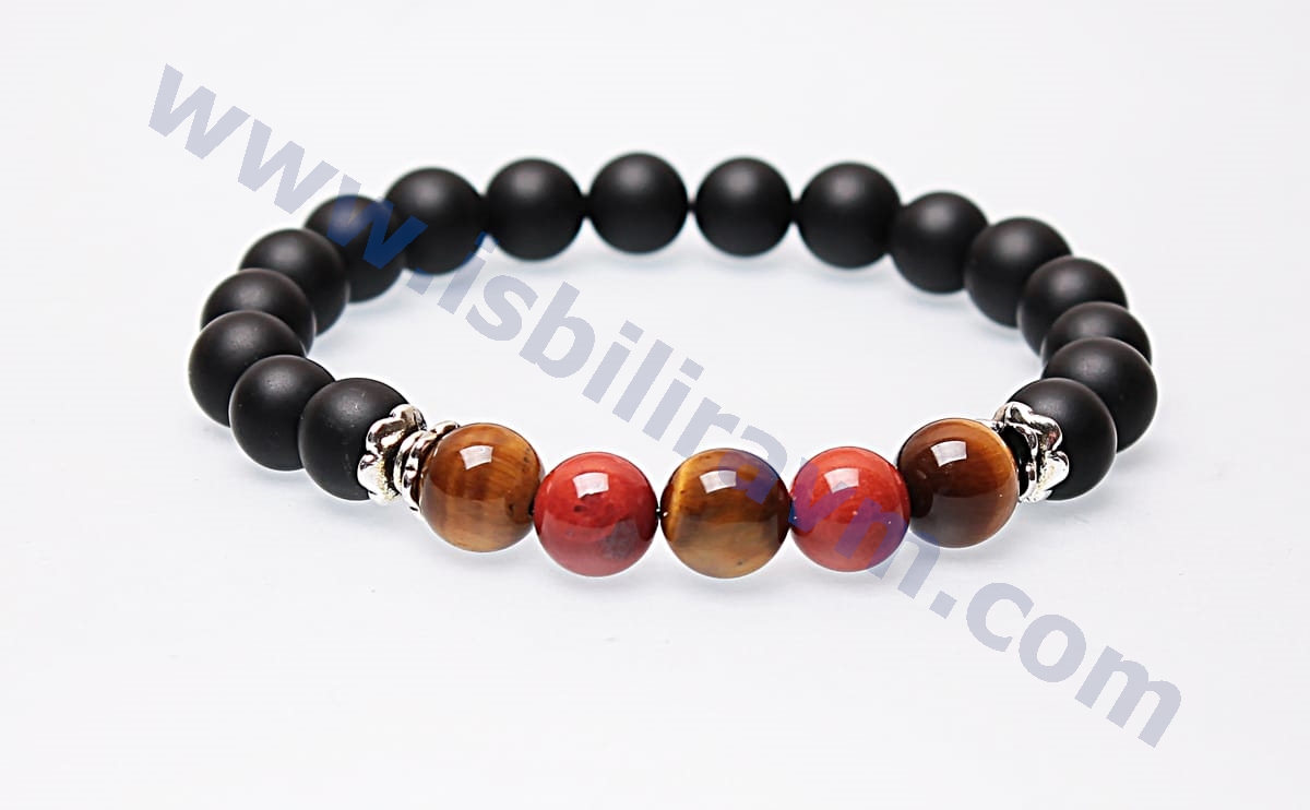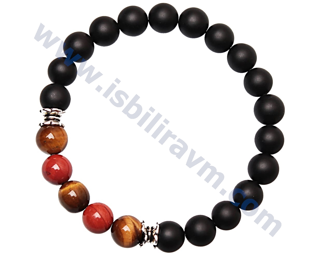 Bu erkek bileklikleri kaplan gözü taşı, oniks ve jasper taşının en güzel tonlarından özel olarak şeçilerek üretilmiştir. Uzun çalışmalar sonucu orjinal taşlardan üretilen bu doğal taş bileklikleri sizler için ürettik. Ürünlerimizde orjinal doğal taşların yanı sıra estetikliğini arttırmak amacıyla bazı süsleme aparatları kullanılmış ve ürünlerin estetik görünümleri arttırılmıştır. Kullanılan bu aparatlar oksitli metal ve  dökümden üretilmiştir, kimyasal bir elementle temasta bulunmadığı taktirde kararmalara karşı uzun süreli dayanıklı, sağlamdır. Ayrıca orjinal erkek bileklik ve takılarımızı firmamızın özel olarak üretmiş olduğu daha önce doğal taşlarda ip kesme problemini ortadan kaldırmak için kullanılan kopma ve dağılmalara karşı dayanıklı, kopmayan taş ipi olan misina lastiğine dizilmiştir. Normal kullanımda bu ip oldukça dayanıklı esnek ve uzun ömürlüdür. Bu özellikleriyle doğal taşlı bileklikleri uzun süreler rahatlıkla kullanabilirsiniz. Bu erkek bileklikleri hem estetik görünmek için takı olarak hemde doğal taşların muhteşem enerji ve faydalarından yararlanabilmek için kullanabilirsiniz. Bu ürün orjinal kaplan gözü, oniks ve jasper taşından üretildiği için kaplan gözü, oniks ve jasper taşının şu psikolojik ve fiziksel faydalara sahiptir ;