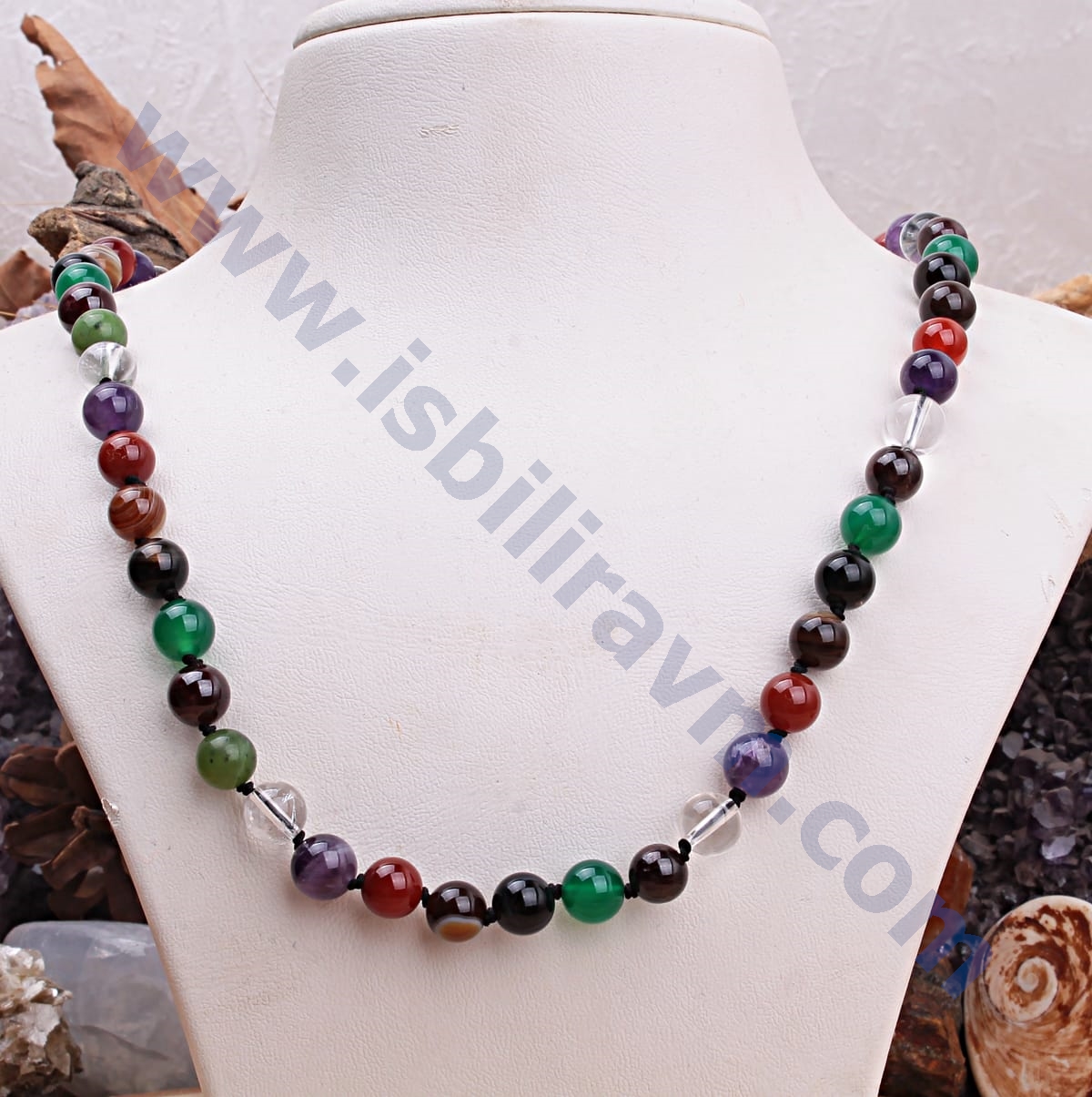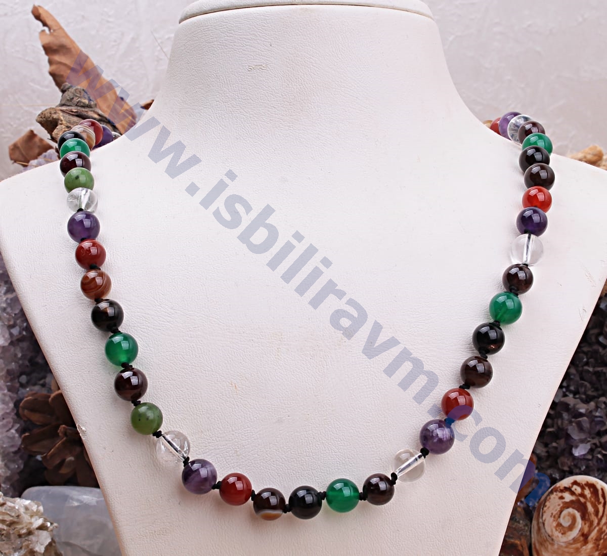 kolyede ametist taşı, kristal kuvars taşı, lal taşı, yeşim taşı ve akik taşı