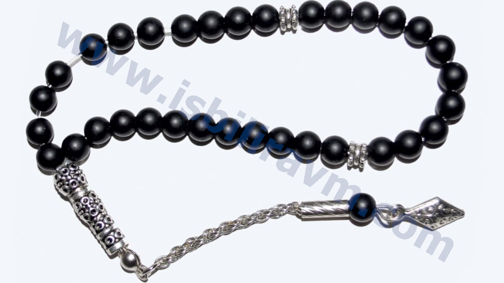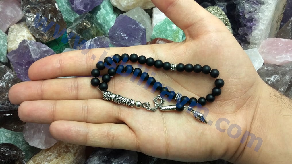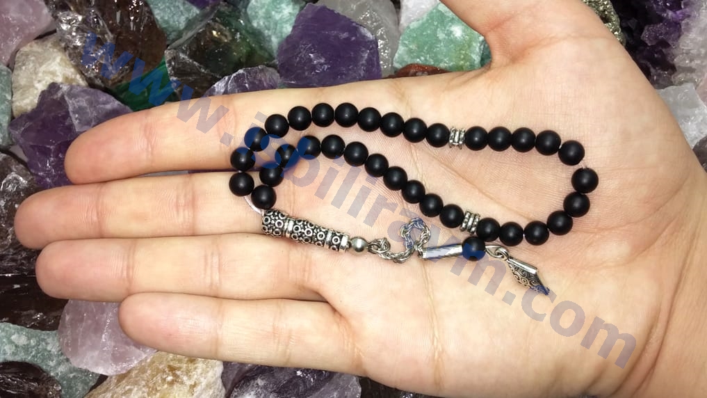 Bu mat oniks doğal taş tesbih mat oniks taşının en güzel tonlarından özel olarak şeçilerek üretilmiştir. Bu mat oniks taşından üretilmiş olan tesbihin püskülü, imameleri, ayracı hiçbir yerde bulamıyacağınız model ve tasarımda olup, bu mat oniks tesbihler  firmamızın bizzat tasarladığı modelde üretilmiştir. Ürünlerimizde orijinal doğal taşların yanı sıra estetikliğini arttırmak amacıyla bazı süsleme tesbih aparatları kullanılmış ve ürünlerin estetik görünümleri arttırılmıştır. Alacağınız tesbihte eğer farklı tesbih aparatı kullanmak isterseniz tesbih malzemeleri kategorimizden püskül veya diğer malzemeleri seçip istediğiniz malzemede tesbihinizi dizdirebilirsiniz, bu isteğinizi sipariş notunda veya irtibat numaralarımızdan bize ulaşarak talep edebilirsiniz. Kullanılan bu aparatlar oksitli metal ve  dökümden üretilmiştir,  kimyasal bir elementle temasta bulunmadığı taktirde kararmalara karşı uzun süreli dayanıklı ve sağlamdır. Ayrıca orijinal doğal taş tesbihlerimiz firmamızın özel olarak üretmiş olduğu  doğal taş tesbihlerde ip kesme problemini ortadan kaldırmak için kullanılan kopma ve dağılmalara karşı dayanıklı, kopmayan taş ipi olan elastik misina tarzı özel lastik ipe dizilmiştir. Normal kullanımda bu ip oldukça dayanıklı esnek ve uzun ömürlüdür. Bu özellikleriyle ürünlerimizi ip kopması, tesbih dağılması gibi problemleri yaşamadan rahatlıkla uzun süreler kullanabilirsiniz. Ayrıca bu özel ipin esnek elastik yapısı itibarı ile; tesbihimiz her bileğe rahatlıkla geçmekte ve böylece zaman zamanda tesbihi bileğinize takarak bileklik olarak da kullanabilirsiniz. Sizlerede özel tasarım ve dayanıklı özel ipiyle üretilmiş, mat oniks tesbih satın almanızı tavsiye ederiz.  Ayrıca mat oniks tesbih fiyatları da toptan fiyatına yakın uygun fiyattatır. Bu doğal taş tesbihleri hem sallamak hemde stres atmak için çekerek kullanabilirsiniz. Ayrıca bu tesbihlerin tane sayısı 33 olduğundan bu tesbihleri zikir çekmek amaçlı veya namazlarda tesbih çekmek amaçlı da kullanabilirsiniz. Çok amaçlı kullanabileceğiniz bu tesbihleri aynı zamanda muhteşem enerji ve faydalarından yararlanabilmek için de kullanabilirsiniz. Bu ürün orijinal mat oniks taşından üretildiği için oniks taşının şu psikolojik ve fiziksel faydalara sahiptir ; Oniks taşı'nın kadın erkek ilişkilerini dengelediği tespit edilmiştir. Evli çiftler arasında uyumluluk sağladığı bilinmektedir. Bağımlılıktan kurtulmaya yardımcı olur. Yani; sigara, alkol vb. hertürlü kurtulmak istediğiniz bağımlılıkdan kurtarır. Oniks taşının kişideki oto kontrol yeteneğini geliştirdiği tespit edilmiştir. Meditasyon sırasında kişinin içini görmeye yardımcı olur. Zararlı seksüel hırsları zayıflatıcı etkileri tespit edilmiştir. Pozitif düşünmemize yardımcı olur. Stres ve depresyona karşı etkilidir. Kişiye mutluluk ve öz güven verir. Oniks taşı şans taşı olarak da bilinir. Cinsel gücü arttırıcı etkileride bilinmektedir. Konsantrasyonu artırır. Negatif enerjiyi ortadan kaldırdığı gibi kişiye pozitif enerji verir. Nazara karşı çok etkili bir taştır. Aşırı gergin kişileri sakinleştirici etkisi vardır. Hertürlü kaygılardan kurtarır insanı. Kişinin korkularından kurtulmasına yardımcı olur cesaret verir. Kulaklar için faydalıdır. Tene deymesiyle birlikte etkisini gösterir duyma gücünü yükseltir. Oniks taşı  mantar hastalıkları ve enfeksiyonlarda kullanılır.