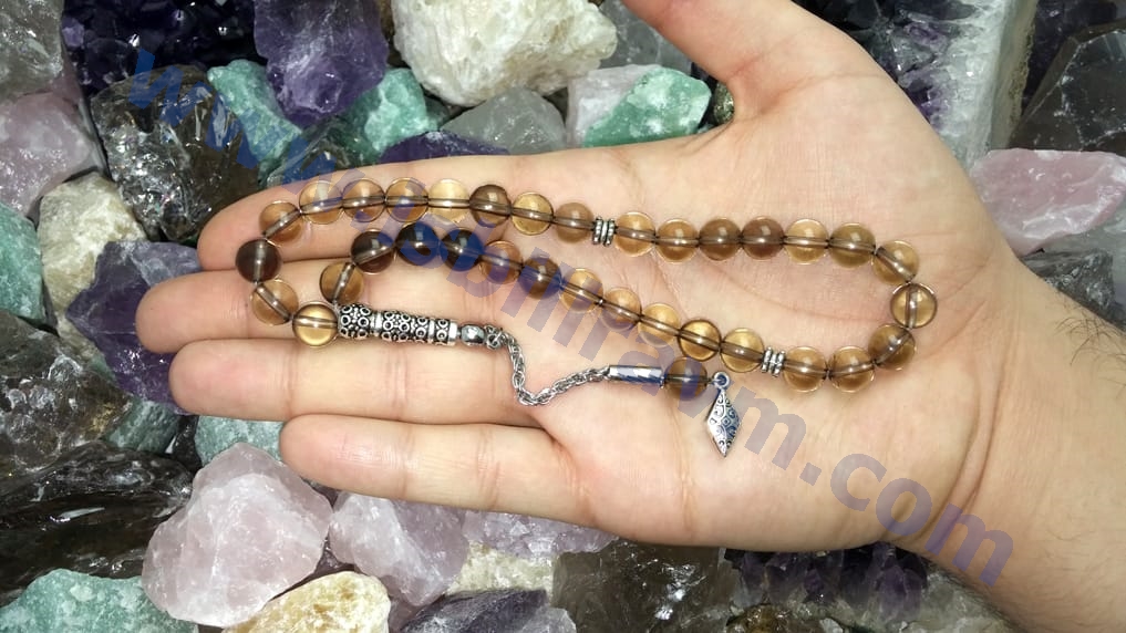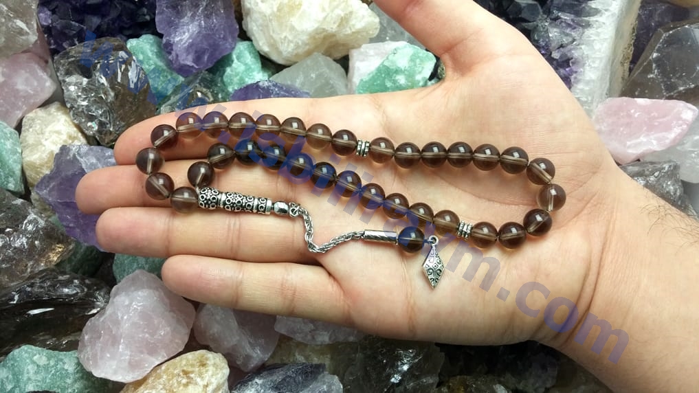 Bu dumanlı kuvars doğal taş tesbih dumanlı kuvars taşının en güzel tonlarından özel olarak şeçilerek üretilmiştir. Bu dumanlı kuvars taşından üretilmiş olan tesbihin püskülü, imameleri, ayracı hiçbir yerde bulamıyacağınız model ve tasarımda olup, bu dumanlı kuvars tesbihler  firmamızın bizzat tasarladığı modelde üretilmiştir. Ürünlerimizde orijinal doğal taşların yanı sıra estetikliğini arttırmak amacıyla bazı süsleme tesbih aparatları kullanılmış ve ürünlerin estetik görünümleri arttırılmıştır. Alacağınız tesbihte eğer farklı tesbih aparatı kullanmak isterseniz tesbih malzemeleri kategorimizden püskül veya diğer malzemeleri seçip istediğiniz malzemede tesbihinizi dizdirebilirsiniz, bu isteğinizi sipariş notunda veya irtibat numaralarımızdan bize ulaşarak talep edebilirsiniz. Kullanılan bu aparatlar oksitli metal ve  dökümden üretilmiştir,  kimyasal bir elementle temasta bulunmadığı taktirde kararmalara karşı uzun süreli dayanıklı ve sağlamdır. Ayrıca orijinal doğal taş tesbihlerimiz firmamızın özel olarak üretmiş olduğu  doğal taş tesbihlerde ip kesme problemini ortadan kaldırmak için kullanılan kopma ve dağılmalara karşı dayanıklı, kopmayan taş ipi olan elastik misina tarzı özel lastik ipe dizilmiştir. Normal kullanımda bu ip oldukça dayanıklı esnek ve uzun ömürlüdür. Bu özellikleriyle ürünlerimizi ip kopması, tesbih dağılması gibi problemleri yaşamadan rahatlıkla uzun süreler kullanabilirsiniz. Ayrıca bu özel ipin esnek elastik yapısı itibarı ile; tesbihimiz her bileğe rahatlıkla geçmekte ve böylece zaman zamanda tesbihi bileğinize takarak bileklik olarak da kullanabilirsiniz. Sizlerede özel tasarım ve dayanıklı özel ipiyle üretilmiş, dumanlı kuvars tesbih satın almanızı tavsiye ederiz.  Ayrıca dumanlı kuvars tesbih fiyatları da toptan fiyatına yakın uygun fiyattatır. Bu doğal taş tesbihleri hem sallamak hemde stres atmak için çekerek kullanabilirsiniz. Ayrıca bu tesbihlerin tane sayısı 33 olduğundan bu tesbihleri zikir çekmek amaçlı veya namazlarda tesbih çekmek amaçlı da kullanabilirsiniz. Çok amaçlı kullanabileceğiniz bu tesbihleri aynı zamanda muhteşem enerji ve faydalarından yararlanabilmek için de kullanabilirsiniz. Bu ürün orijinal dumanlı kuvars taşından üretildiği için dumanlı kuvars taşının şu psikolojik ve fiziksel faydalara sahiptir ; en çok bilinen ve kullanılan özelliği panik atağa iyi gelmesidir. Meditasyon sırasında kullanılabilecek bir taştır. Sinir bozukluklarına iyi gelir. Strese iyi gelir. Ayak hastalıklarında etkilidir. Aşırı kıramplara iyi gelir. Güven duygusunu arttırır. Kişinin yeni deneyimlere açık olmasına yardımcı olur. Girişimcilik yeteneğini arttırır. Kişinin yaşanılan ana odaklanıp o anı en iyi şekilde yaşamasına yardımcı olur.İletişim bozukluklarını giderici etkileri vardır. Korkunç kabuslar görmemizi engeller. Kişiye huzur ve sakinlik verir. Negatif enerjinin pozitif enerjiye dönüştürülmesine yardımcı olur.